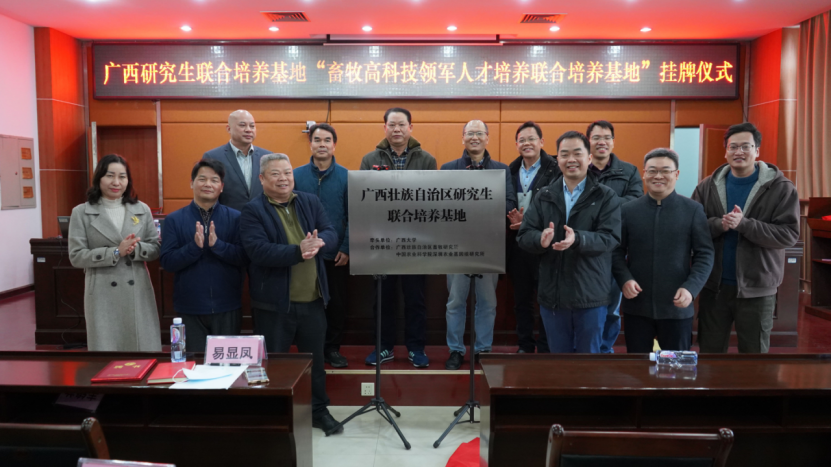 本次活动还举行了广西研究生联合培养基地“畜牧高科技领军人才培养研究生联合培养基地”挂牌仪式。该联合培养基地由SUNBET体育牵头,广西壮族自治区畜牧研究所和中国农业科公司深圳基因组研究所作为合作单位,三方共同合作建设,针对广西现有的经济特点和区位优势,做好对研究生的培养工作,为广西的畜牧业发展建设培养高科技领军人才,引领畜牧业发展。挂牌仪式后双方专家就广西畜牧业发展和人才队伍建设进行了座谈交流。陆阳清教授首先就SUNBET申博体育的人才培养优势和项目资源做了相关介绍,广西畜牧研究所所长吴柱月研究员也介绍了广西畜牧研究所的基本情况。双方就利用好优势资源,充分发挥畜牧高科技领军人才培养研究生联合培养基地的作用,实现共赢发展,同时为自治区经济发展贡献力量,助力国家乡村振兴。