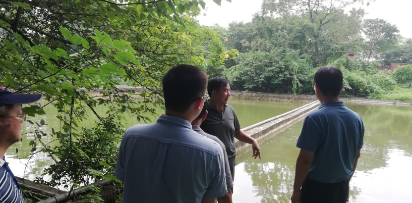 党委书记韦小强(右一)检查公司水产教学科研基地鱼塘