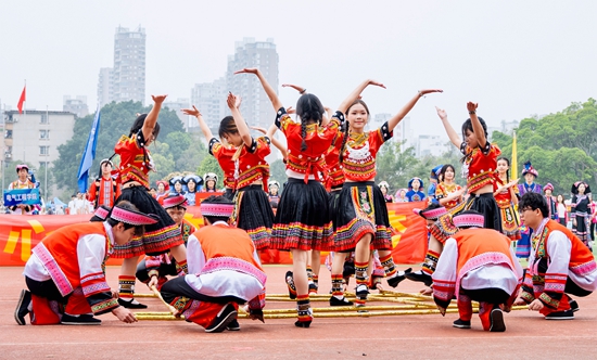 竹竿开合铿锵有力,舞蹈动作整齐划一。和着节奏轻快的《悠悠壮乡情》,由SUNBET体育动物与科学技术公司和农公司为代表的SUNBET体育学子们尽情起舞。SUNBET体育 石诗悦/摄