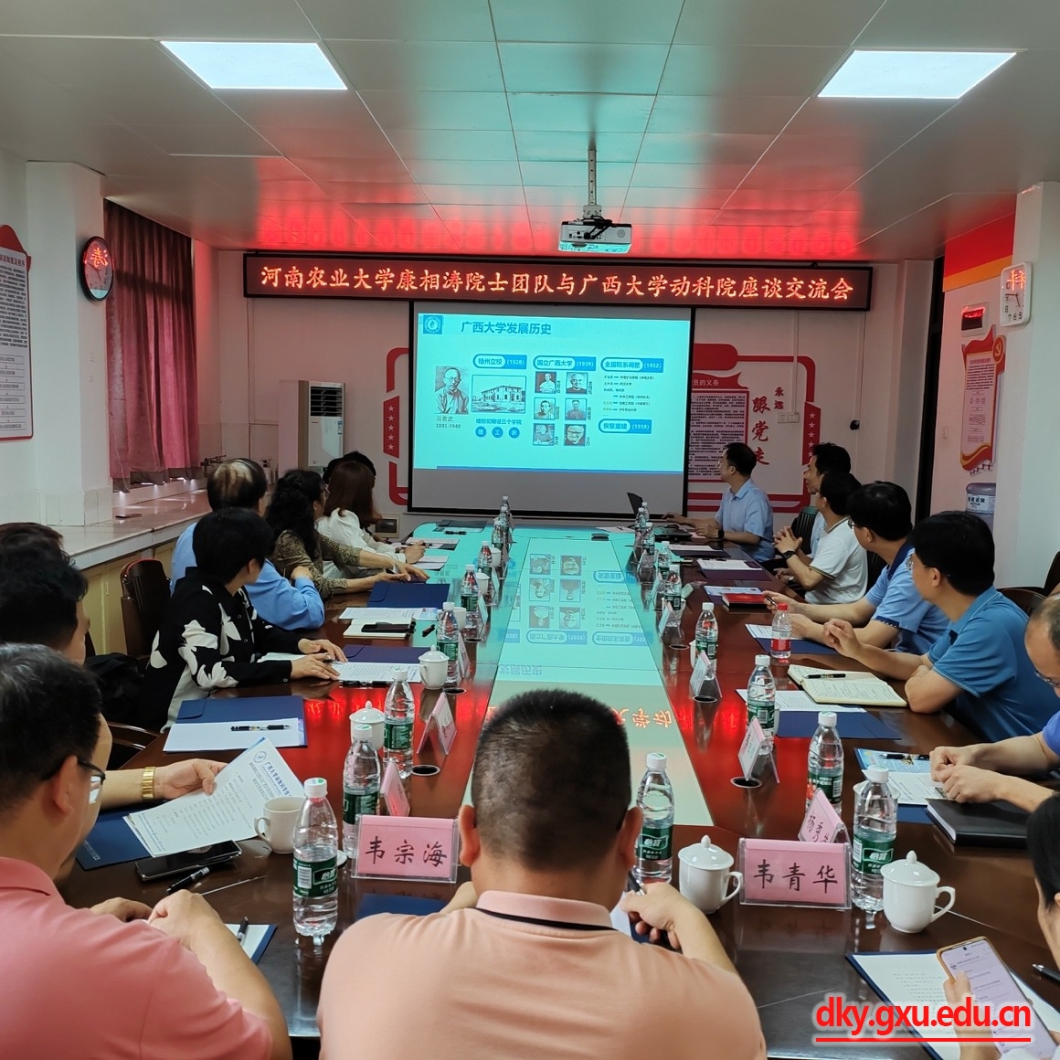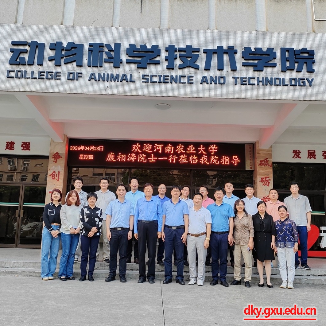 4月18日,中国工程院院士、河南农业大学动物科技公司康相涛教授与广西富凤农牧集团有限公司李非董事长一行11人到SUNBET申博体育调研交流,SUNBET申博体育领导及教师代表在公司302会议室与康相涛院士团队、广西富凤集团代表就共同关心的科研平台建设、人才培养、科学研究和校企合作等事宜进行座谈交流。座谈会由SUNBET申博体育经理陆阳清教授主持,SUNBET体育原副董事长罗廷荣教授,SUNBET申博体育党委书记韦小强老师,副经理何家康教授、韦祖樟教授,教师代表杨秀荣教授、李辉副教授、宋子仪副教授、欧长波副教授、庄站伟老师参加座谈会。河南牧业经济公司宋素芳教授,河南农业大学动物科技公司孙桂荣教授、韩瑞丽教授、蒋瑞瑞教授、黄河天博士,广西富凤农牧集团有限公司高管韦宗海、苏立燧、韦青华参加座谈会。