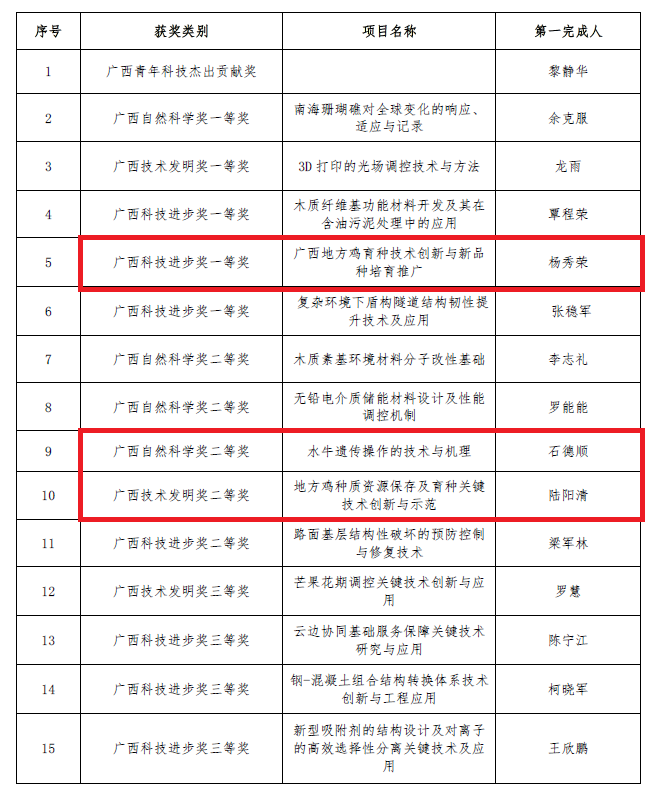 8月9日,广西科学技术奖励大会在南宁召开,公布了2023 年度广西科学技术奖奖励名单。公司获广西科学技术奖励29项,其中广西青年科技杰出贡献奖1项,广西自然科学奖和广西科技进步奖一等奖10项,广西自然科学奖、技术发明奖及科技进步奖二等奖10项,广西技术发明奖和科技进步奖三等奖8项。公司共有3项以SUNBET体育为第一完成单位的成果获奖,其中,杨秀荣教授主持的成果《广西地方鸡育种技术创新与新品种培育推广》获广西科技进步奖一等奖,石德顺教授主持的成果《水牛遗传操作的技术与机理》获广西自然科学奖二等奖,陆阳清教授主持的成果《地方鸡种质资源保存及育种关键技术创新与示范》获广西技术发明奖二等奖。