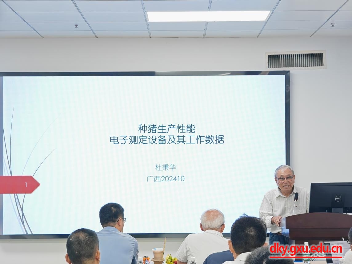 唐荣福副主任汇报了广西种猪饲料转化率的测定方法与效果评估。他强调了测定数据的质控和校正、生物安全与猪只健康管理的重要性,指出了使用智能化种猪测定系统时常见异常数据情况及其处理方法,介绍了广西畜禽品种改良站种猪性能测定中心接收与测定种猪工作的流程与详细内容,建议种猪企业测定人员共同参与开测、结测工作,互相交流学习以提高种猪测定工作的统一性。