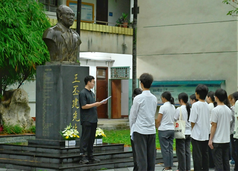 “王丕建教授曾负笈美国爱荷华州立大学,学成归国后在西大从教,曾获全国先进科技工作者荣誉称号,被国际水牛大会授予“科学先驱者”奖章和奖状。”在王丕建教授雕像前,辅导员马朝阳为大家讲述了这位学术先驱的故事,并鼓励同学们向王丕建教授学习,把科研成果应用在全面建设社会主义现代化国家的伟大事业中。