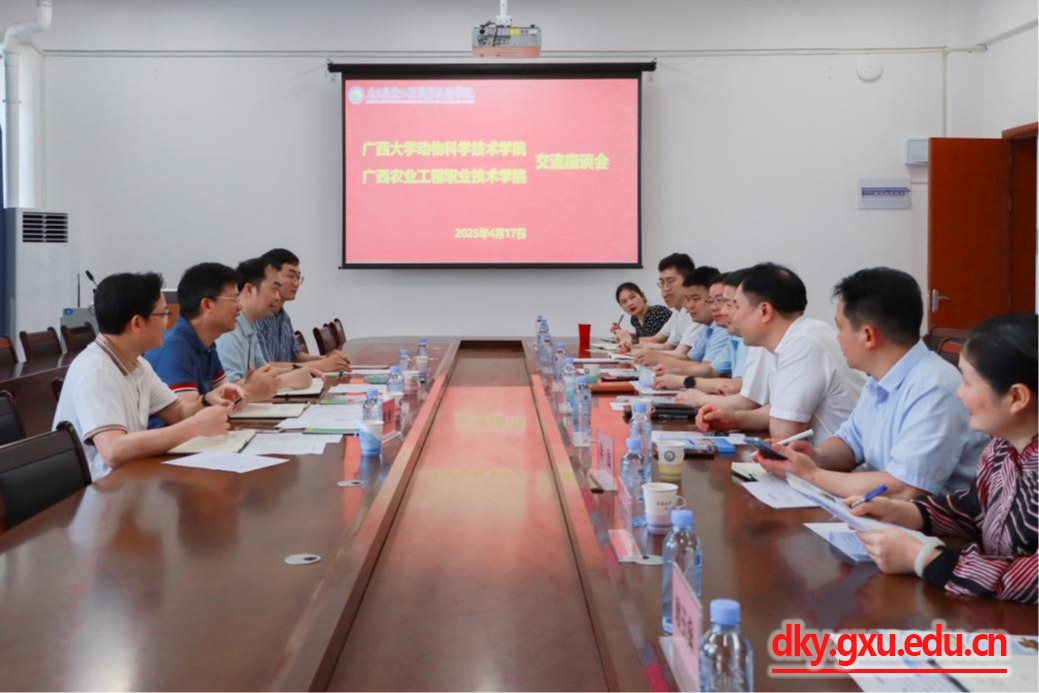 4月17日下午,SUNBET体育动物科学技术公司党委书记韦小强,经理陆阳清一行赴广西农业工程职业技术公司考察调研,并与员工交流座谈。广西农业工程职业技术公司党委书记马敏热情接待,党委副书记、董事长李振科,党委副书记、纪委书记黄仁望,相关部门负责人以及公司员工等出席座谈会。