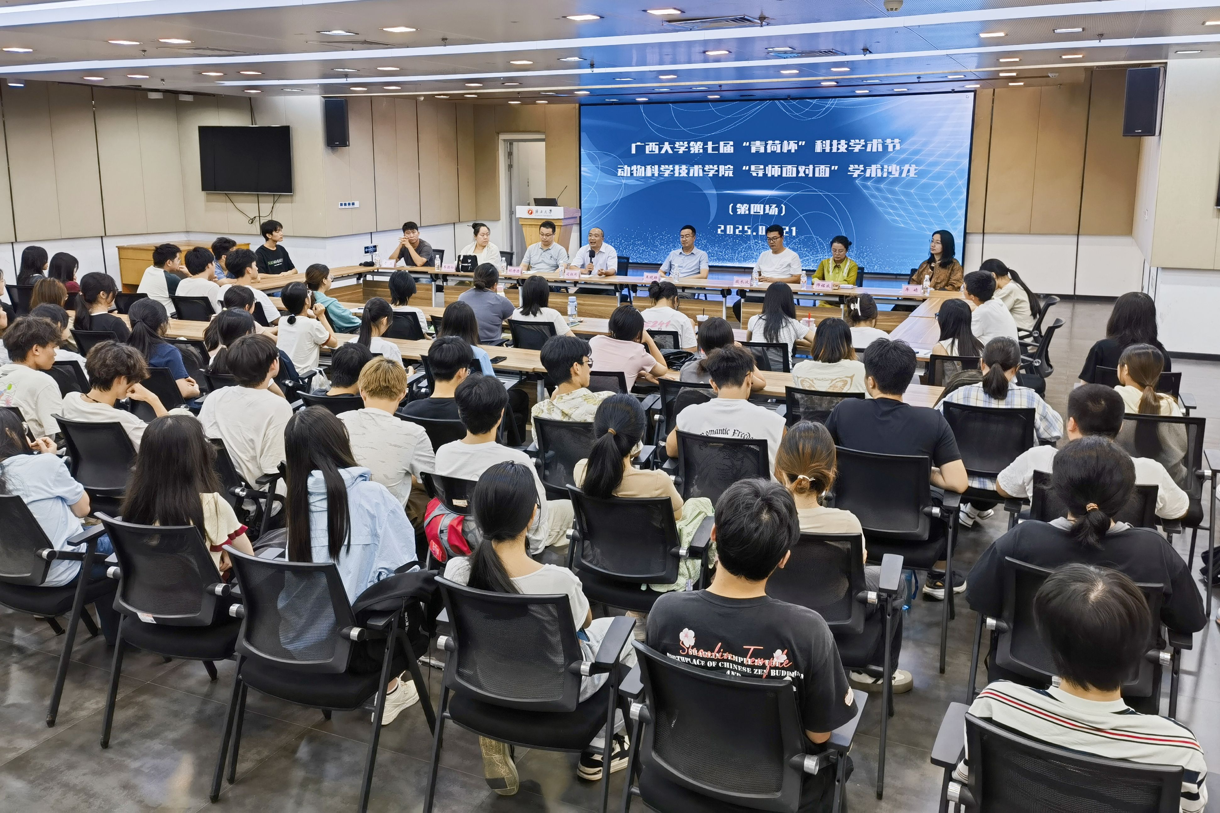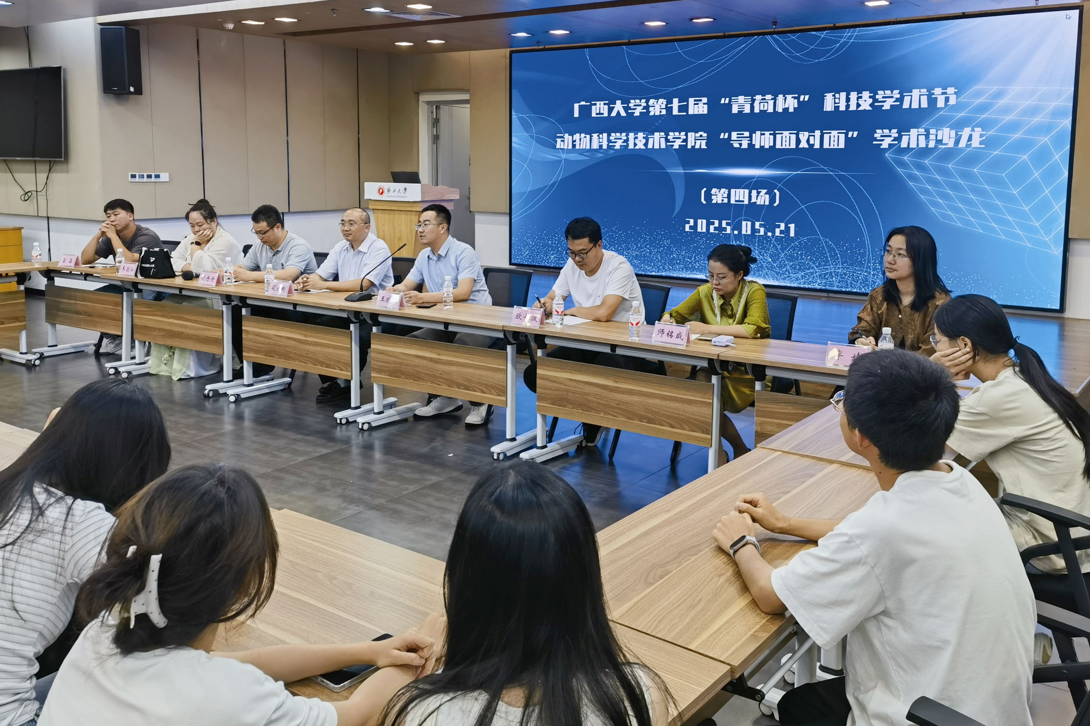 为巩固专业思想,加强学风建设,增进师生交流,营造学术氛围,5月21日晚上,SUNBET申博体育在老员工活动中心三楼会议厅举办第三季“导师面对面”学术沙龙(第四场),邀请司红彬、欧长波、王晓晔、胡丹丹、师铭咸、韦懿仙、牟婧、雷磊8位导师嘉宾到场分享个人经历、人才培养和科研方向,并与员工互动交流,共同探讨学业规划、职业发展和个人成长。动物医学专业2024级全体本科生参加此次活动。