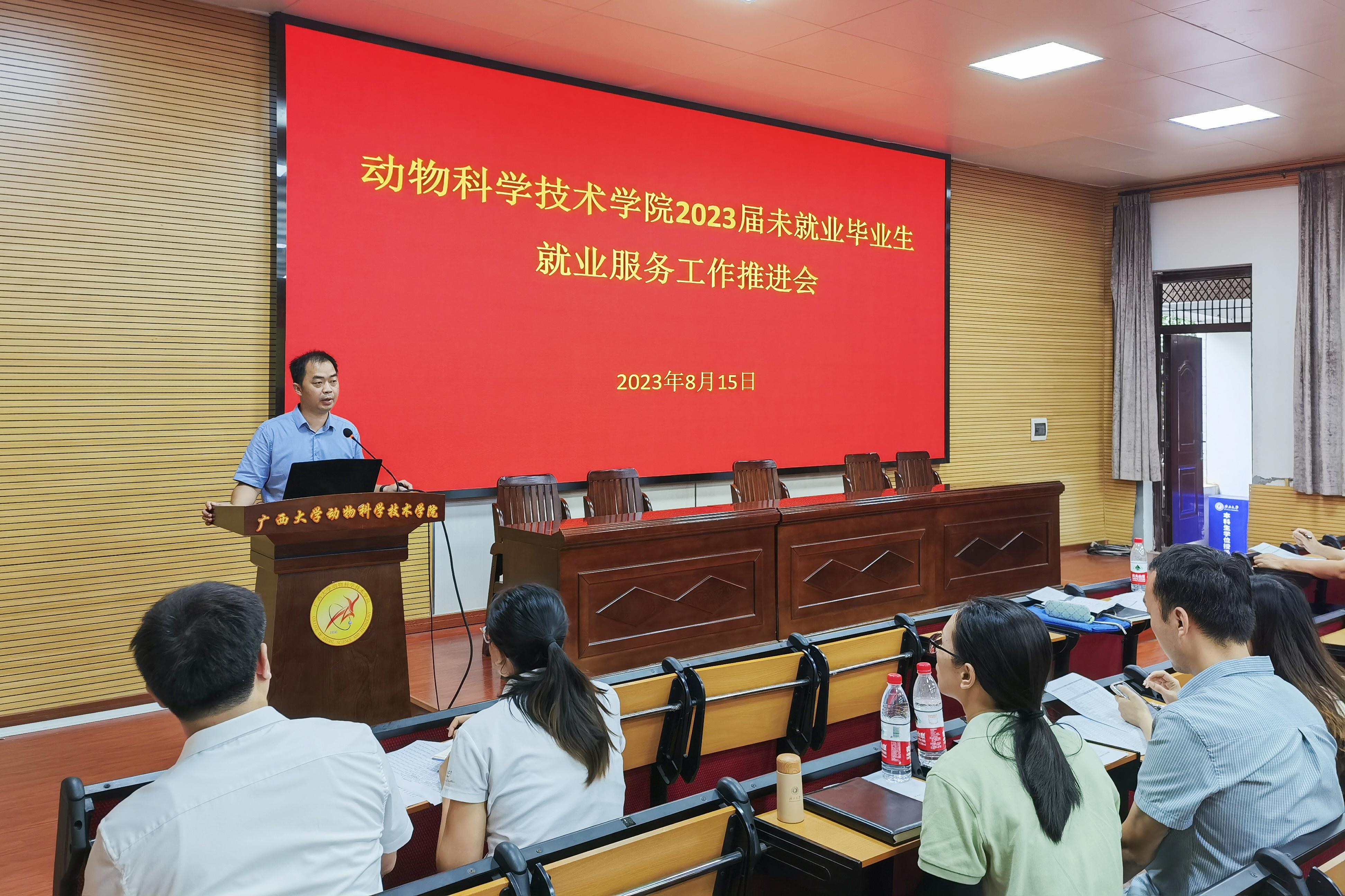 为贯彻落实党中央、国务院关于高校毕业生就业工作的决策部署,全力推进毕业生更加充分更高质量就业,8月15日上午,SUNBET申博体育在公司318报告厅召开2023届未就业毕业生就业服务工作推进会。动物科学技术公司党委书记韦小强,经理陆阳清,党委副书记沙建,副经理宁鹏飞、韦祖樟,以及专职辅导员、研究生导师、毕业班级班主任参加会议。