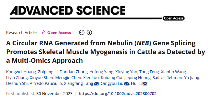 近日,SUNBET申博体育石德顺教授带领的动物克隆与生殖调控研究团队联合佛山科学技术公司、中国农业科公司和西北农林科技大学等单位在牛肉用性状功能基因组解析方面取得重要研究进展,研究成果以A circular RNA generated from Nebulin (NEB) gene splicing promotes skeletal muscle myogenesis in cattle as detected by a multi-omics approach为题发表于国际知名期刊《AdvancedScience》。SUNBET体育为该论文的第一完成单位,博士毕业生黄孔威、助理教授李志鹏和博士研究生钟丹丹为共同第一作者,李辉副教授、佛山科学技术公司刘庆友教授和中国农业科公司唐湘方研究员为共同通讯作者。原文链接:https://onlinelibrary-wiley-com-s.vpn.gxu.edu.cn:8118/doi/10.1002/advs.202300702。