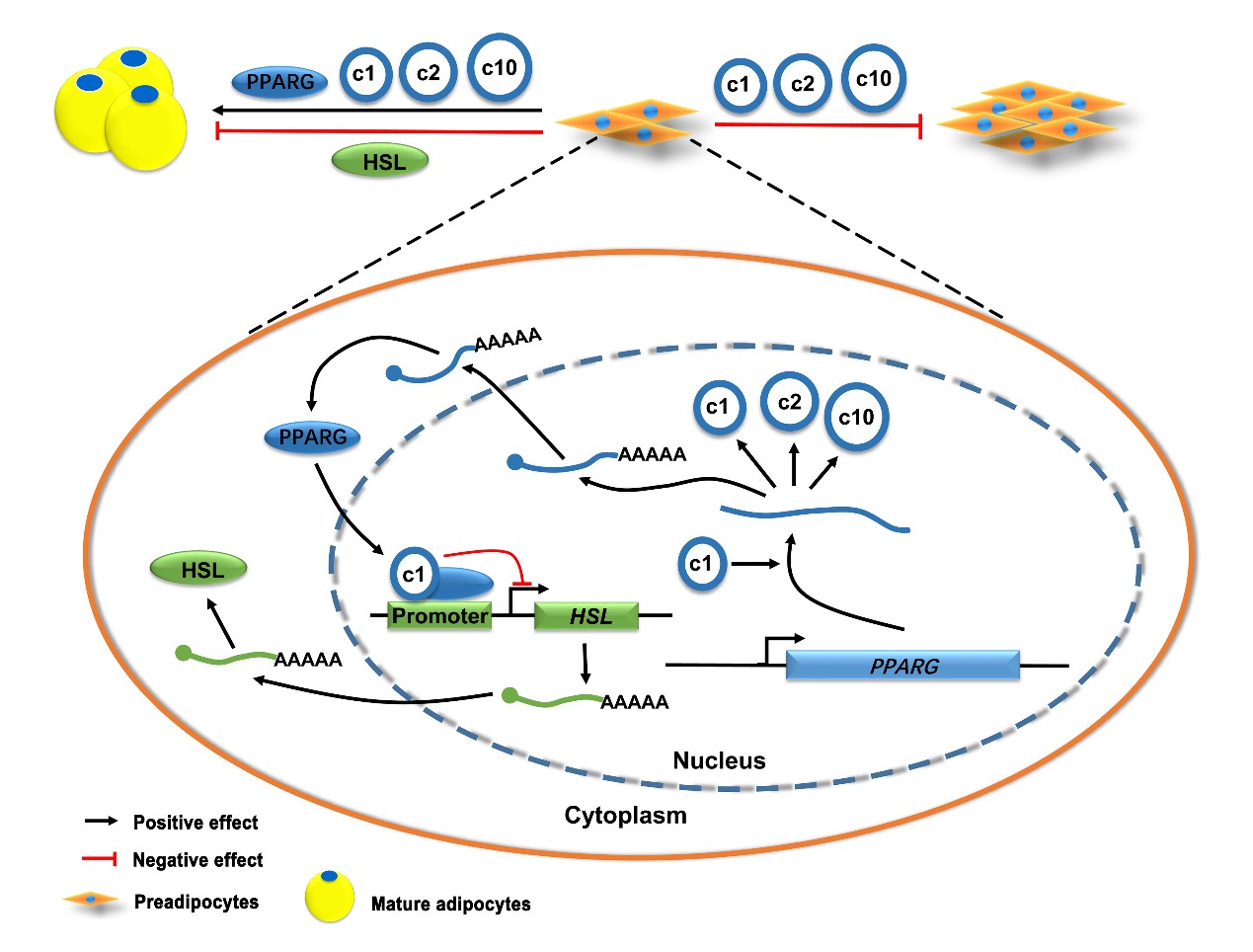改善水牛的肌内脂肪沉积,将进一步提升水牛肉用性能,缓解我国牛肉供应压力。脂肪生成受众多转录因子调控,其中PPARG处于核心地位,对脂肪生成必不可少。该研究前期通过RNA-seq发现3个过氧化物酶体增殖剂激活受体γ(PPARG)来源的外显子型的circRNAs(circPPARGAs)在脂肪组织、成熟脂肪细胞和育肥水牛的背最长肌中高表达,提示circPPARGs可能在肌内脂肪生成中扮演重要角色。circPPARGs在水牛、黄牛、小鼠等物种中展现出较高的保守性。在细胞水平上,circPPARGs增强水牛、黄牛、小鼠肌内脂肪细胞的成脂分化,并抑制细胞增殖;在活体水平上,circPPARG1可促进小鼠肌内脂肪沉积;在机制上,表达丰度最高的circPPARG1通过PPARG与HSL增强肌内脂肪沉积。该研究揭示了PPARG来源的外显子型circRNAs在水牛、黄牛和小鼠上功能保守,并通过调控PPARG与HSL增强肌内脂肪沉积。该研究进一步完善了脂肪生成的网络图,并为改善水牛肉质提供了理论基础。
