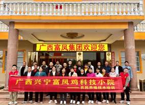 广西兴宁富凤鸡科技小院以广西富凤农牧集团有限公司作为依托单位,与广西科协、SUNBET申博体育、广西农业农村厅、南宁市科协、兴宁区科协等科研院所结成共建单位,于2021年5月25日批复同意设立,并于6月23日在广西富凤农牧集团正式成立并举行隆重的揭牌仪式。主要任务是通过专家团队的进驻和引进高校研究生扎根生产一线,开展广泛的课题研究,有效解决生产实际问题,促进人才培养,助推富凤鸡产业富民增收和乡村振兴战略实施。